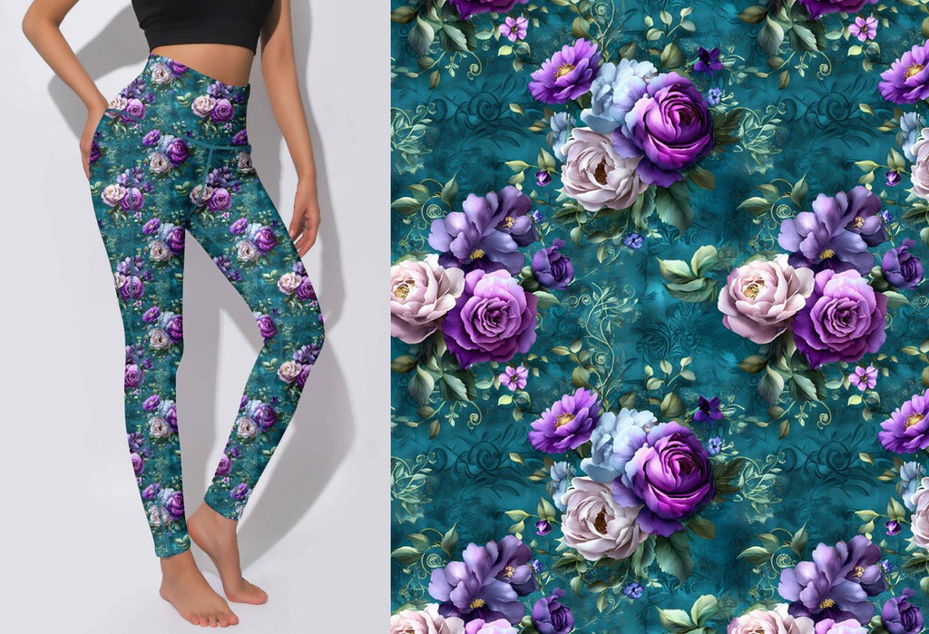 Active Leggings - Purple Roses on Teal